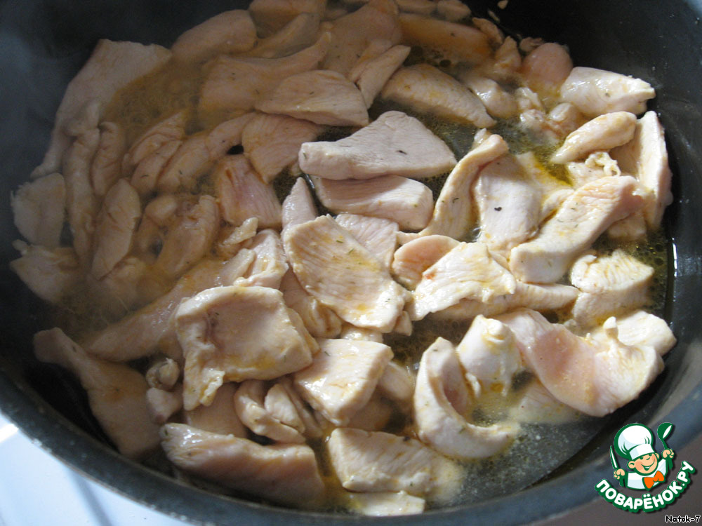 филе куриной грудки нарезать на тонкие, небольшие кусочки, затем тушить их на сковородке до мягкости. Посолить и добавить специи по вкусу.
