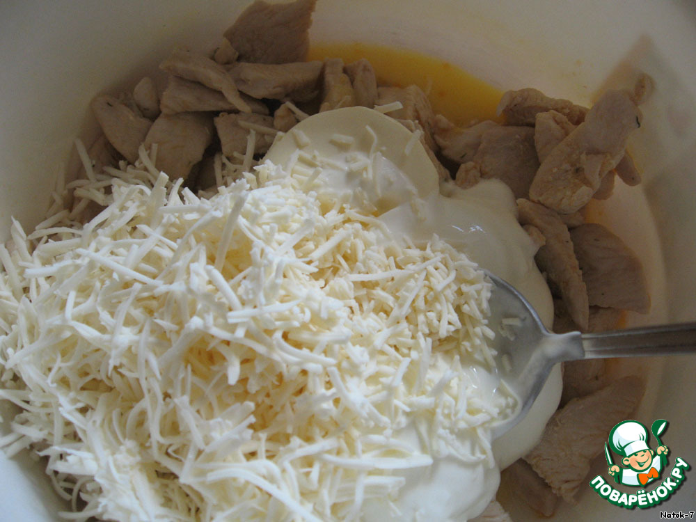 К куриному филе добавить яичные желтки, 4 ложки жирной сметаны, натертый копченый сыр.