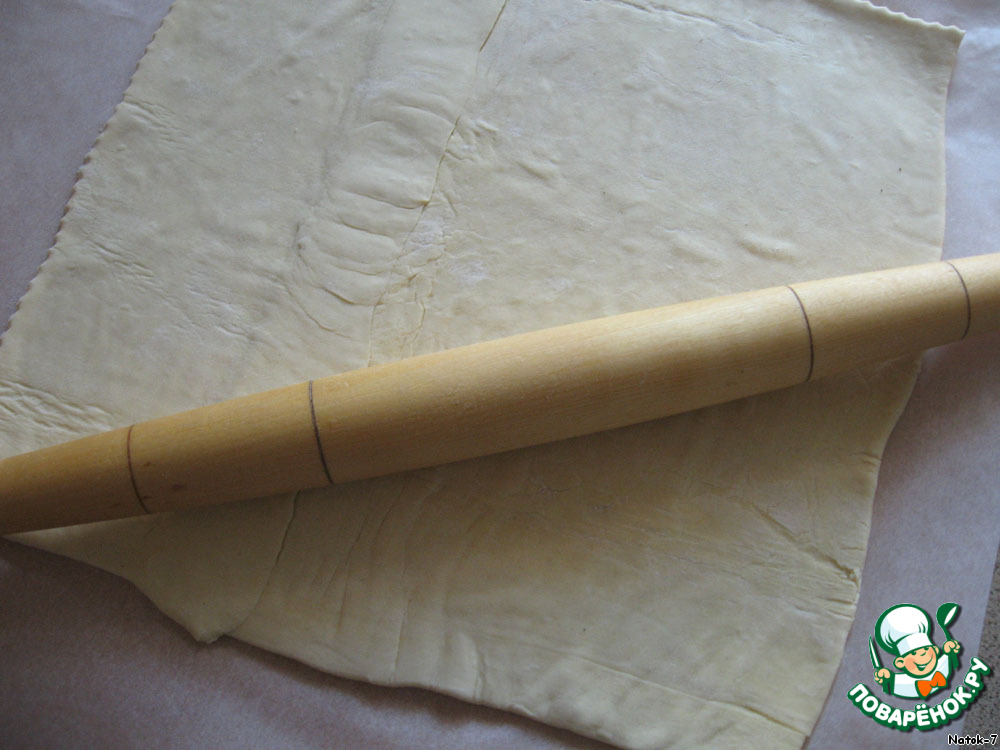 Слоеное бездрожжевое тесто раскатать на бумаге для выпечки (две части склеить внахлест).