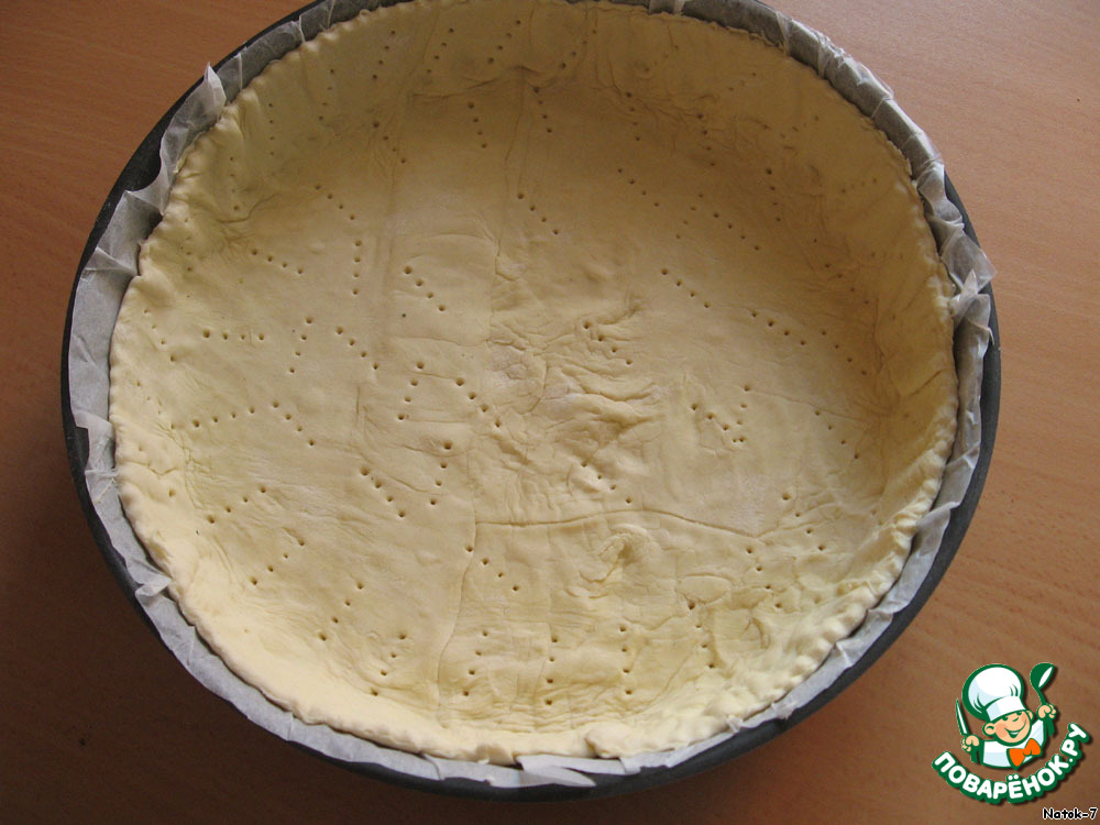 Положить раскатанное тесто в форму для выпечки так, чтобы были бортики, обрезать неровные края.