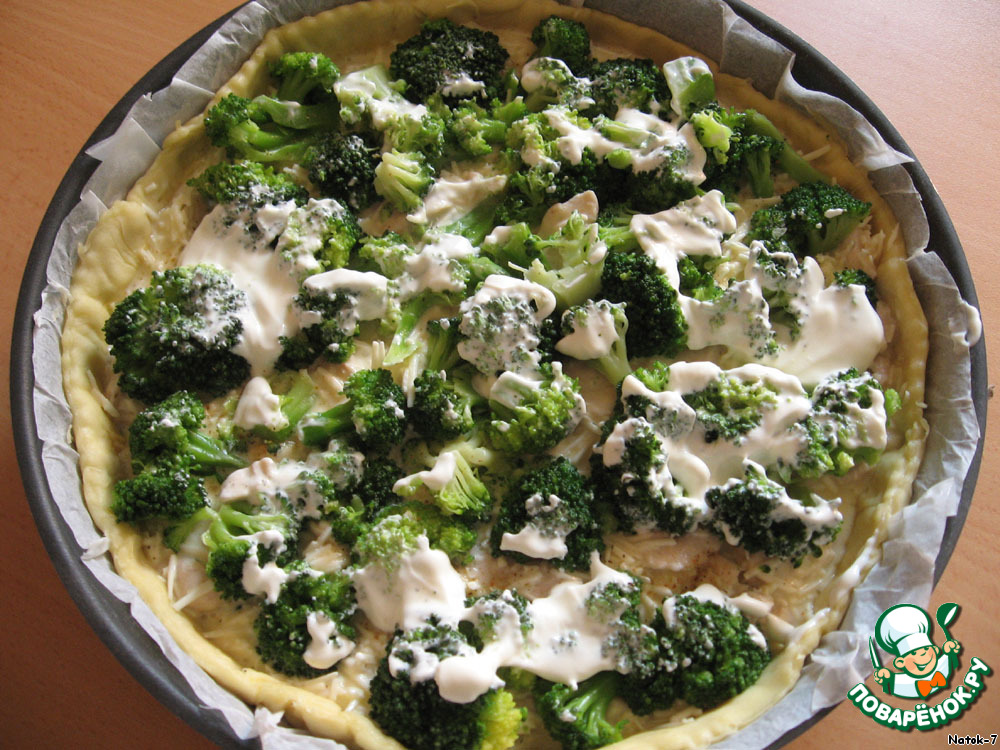 Затем сверху уложить кусочки брокколи. Немного еще смазать это все сметаной. Поставить в разогретую до 200 градусов духовку и печь, пока крайчики пирога самую малость не зарумянятся. Не передержите!