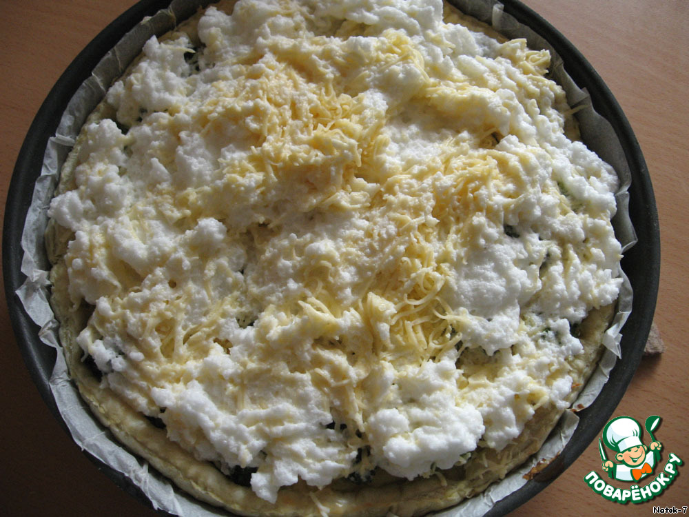 Когда пирог немного схватился, вынуть его из духовки и выложить сверху начинки слой сырного безе. Затем снова его поставить в духовку и печь до готовности.