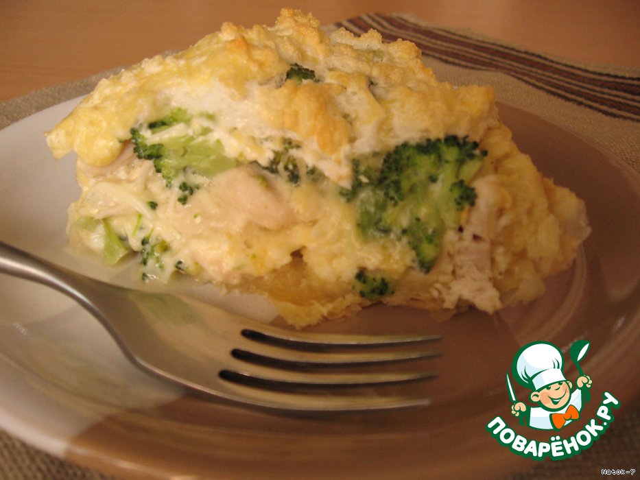 | Приятное сочетание куриного филе, брокколи и сыра, покрытое нежнейшим сырным безе, которое создает очень гармоничную начинку этого пирога на основе из слоеного теста. |