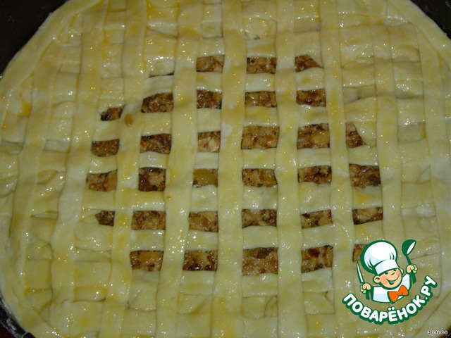 Оформляем верх пирога, смазываем желтком и выпекаем пирог в духовке при температуре 180 гр. до золотистого цвета.