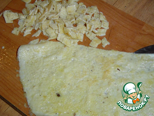 Взбиваем 3 яйца и обжариваем на сливочном масле, нарезаем небольшими кусочками.