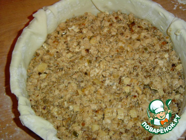 Раскатываем тесто, форму смазываем маслом и выкладываем тесто. На тесто кладем начинку.