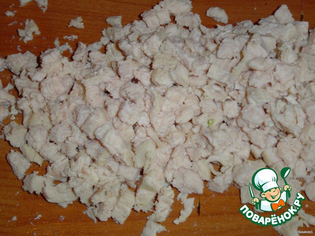 Отвариваем курятину и нарезаем мелкими кубиками.