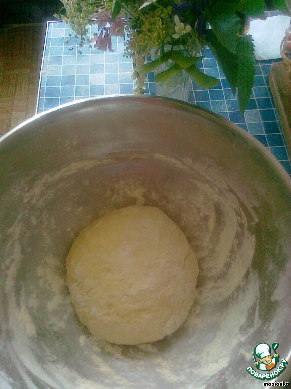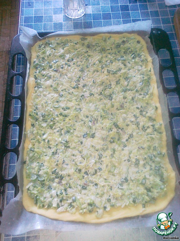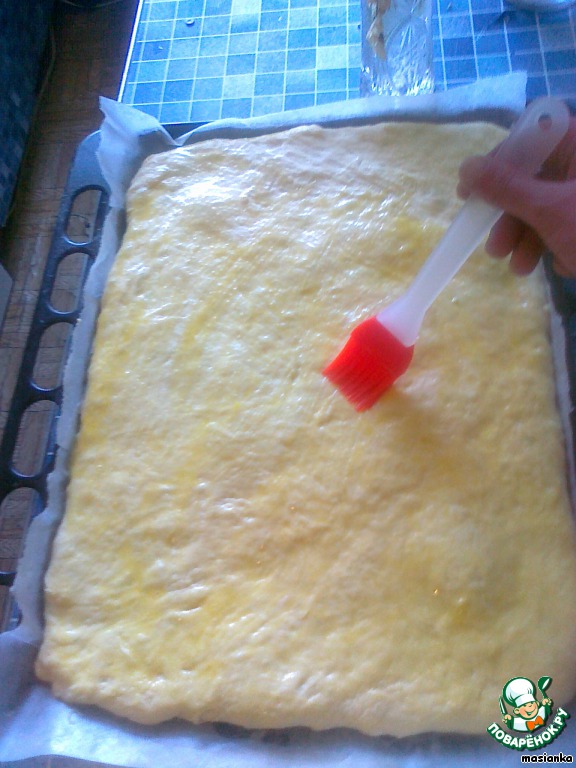 Когда тесто подошло, делим его на две части, одну чуть меньше другой. Большую часть раскатываем и выкладываем на противень, выложенный бумагой для выпечки (пропитываю её дополнительно смальцем).