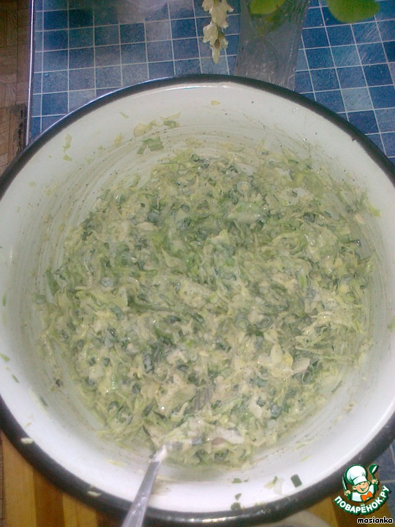 Готовим начинку. Шинкуем капусту, режем туда лучок, солим и много перчим (чтобы видно было точки). Добавляем туда майонез, почти пачку.