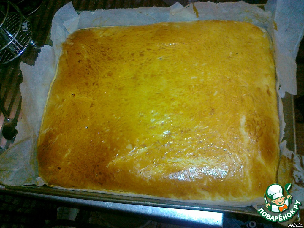 Раскатываем вторую часть теста и накрываем пирог. Защипать края и подвернуть их под низ. Смазываем яйцом и ставим в разогретую духовку (220*) выпекать.