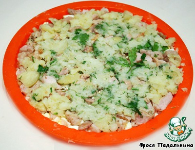 Форму (лучше глубокую) смазать маслом. Выложить половину картофеля с зеленью.