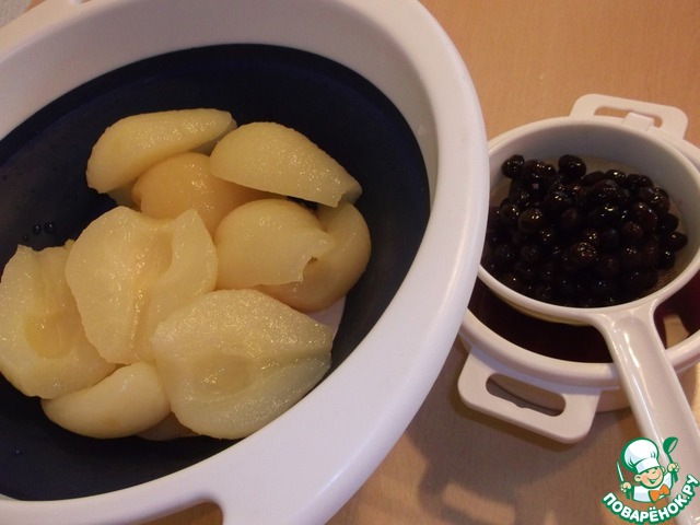 Вскроем банки с грушами и клюквой, откинем на сито для стёка лишней жидкости.