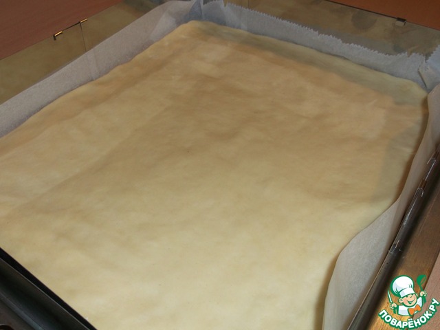 У меня такого высокого противня нет, зато есть раздвижная рамка для выпечки десертов - её я и применила.