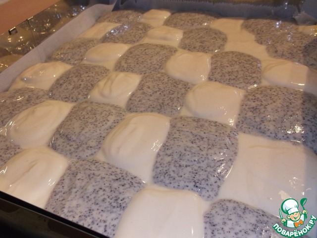 Теперь вооружившись двумя ложками, чередуя обе начинки, распределяем её по всей поверхности теста.