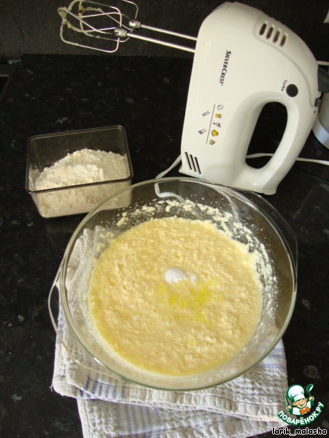 Затем ввести разрыхлитель, ванилин, соль и муку.