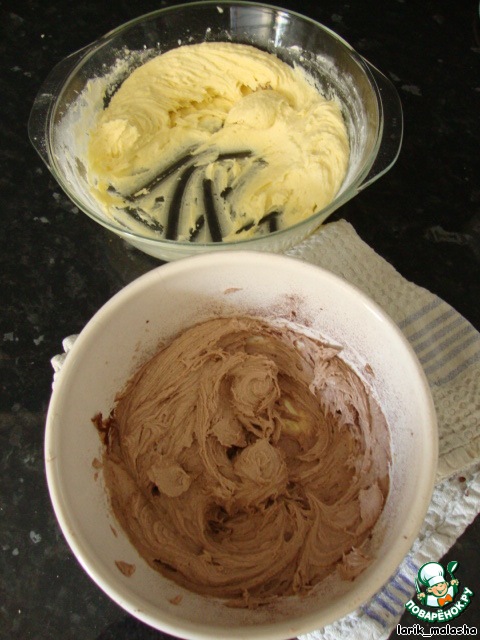Поделить полученное тесто на 2 равные части, в одну из которых добавить какао-порошок, взбить. Получается 2 вида теста разных цветов.