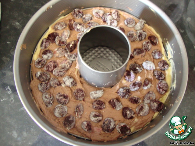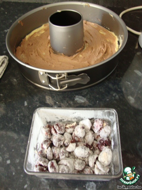 Вишню предварительно разморозить и немного посыпать мукой (так из вишни не будет выделяться лишний сок).
