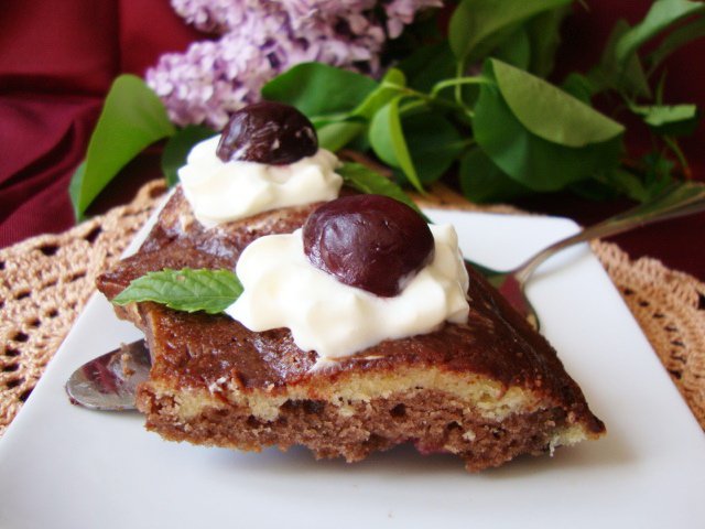 Желательно поставить тортик в холодильник, чтобы глазурь застыла. Можно украсить взбитыми сливками и вишней.
