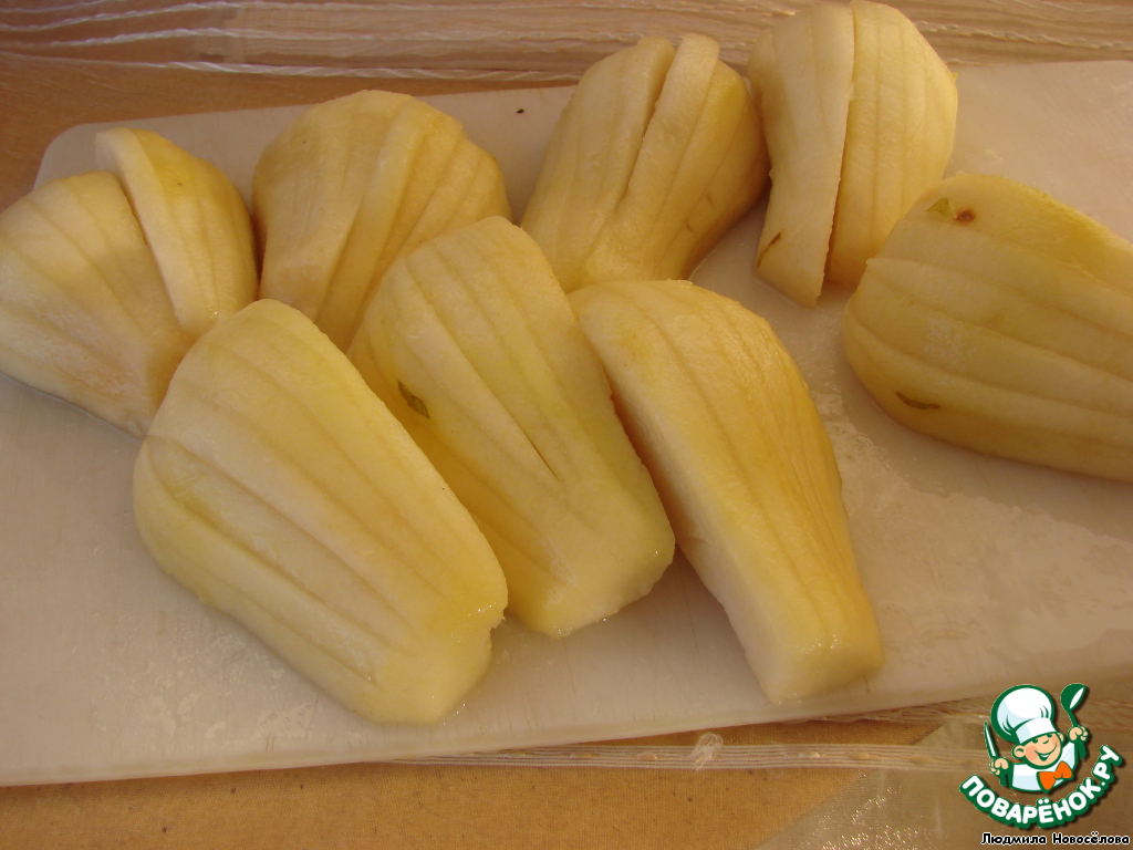 Груши почистить, разделить на четвертинки, надрезать, но не до конца.
