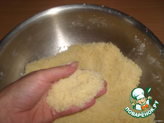 ...перетираем между ладонями до тех пор пока не получится крошка.Кто любит послаще можно увеличить кол-во сахара. Кол-во муки тоже условно - всё зависит от качества масла.В общем держим руку на пульсе.