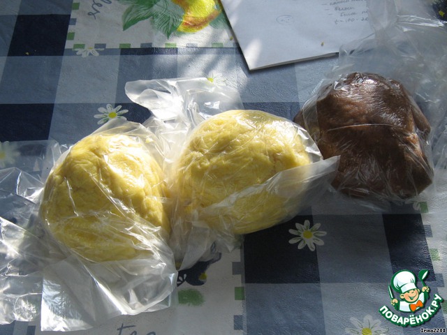 Маргарин (масло) натереть на терке, добавить муку, соду, желтки, 40 грамм сахара и замесить тесто