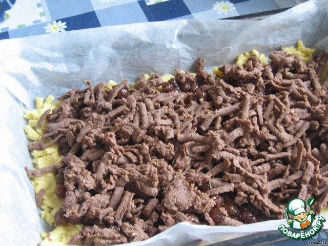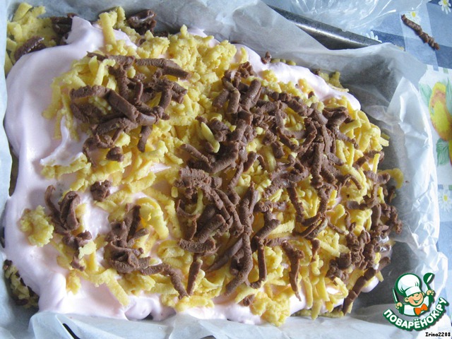Затем выложить безе и натереть вторую половину белого теста. У меня темного теста много было, поэтому я его еще сверху присобачила)