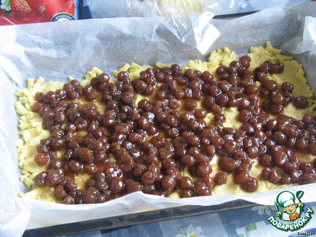Достаем тесто и начинаем складывать пирог - натираем первую часть белого теста, чуть приминаем руками и выкладываем джем. У меня были вот такие милые ягодки