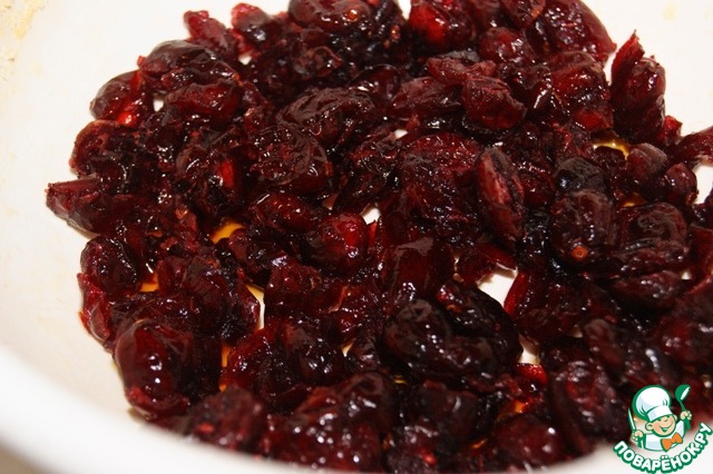 Просеять вместе крахмал, муку и разрыхлитель. Клюкву замочить в роме.