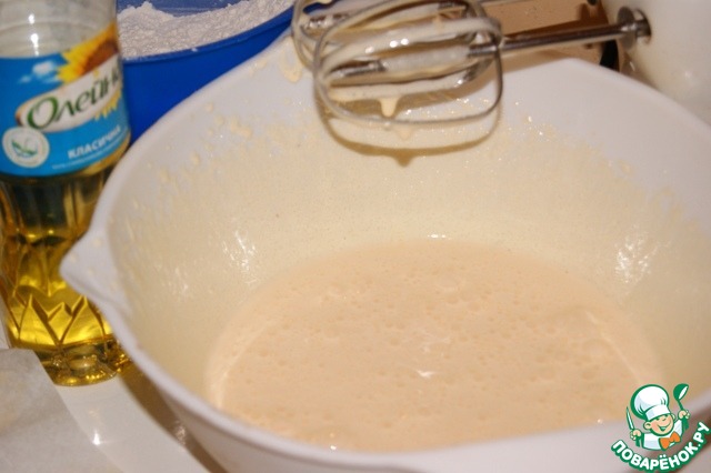 Перевести миксер на среднюю скорость и не переставая взбивать ввести тонкой струйкой масло.