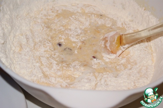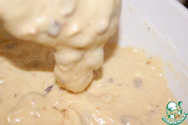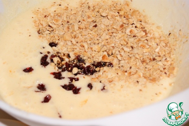 Добавить клюкву, половину орехов и перемешать лопаткой.
