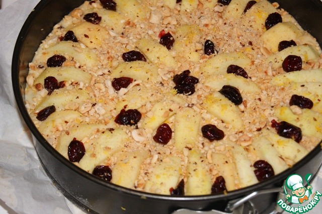 Поместить тесто в форму 23 см в диаметре, дно которой застелить пекарской бумагой. Слегка вдавить в него очищенные и нарезанные на дольки яблоки, украсить клюквой и посыпать лимонной цедрой и оставшимися орехами.