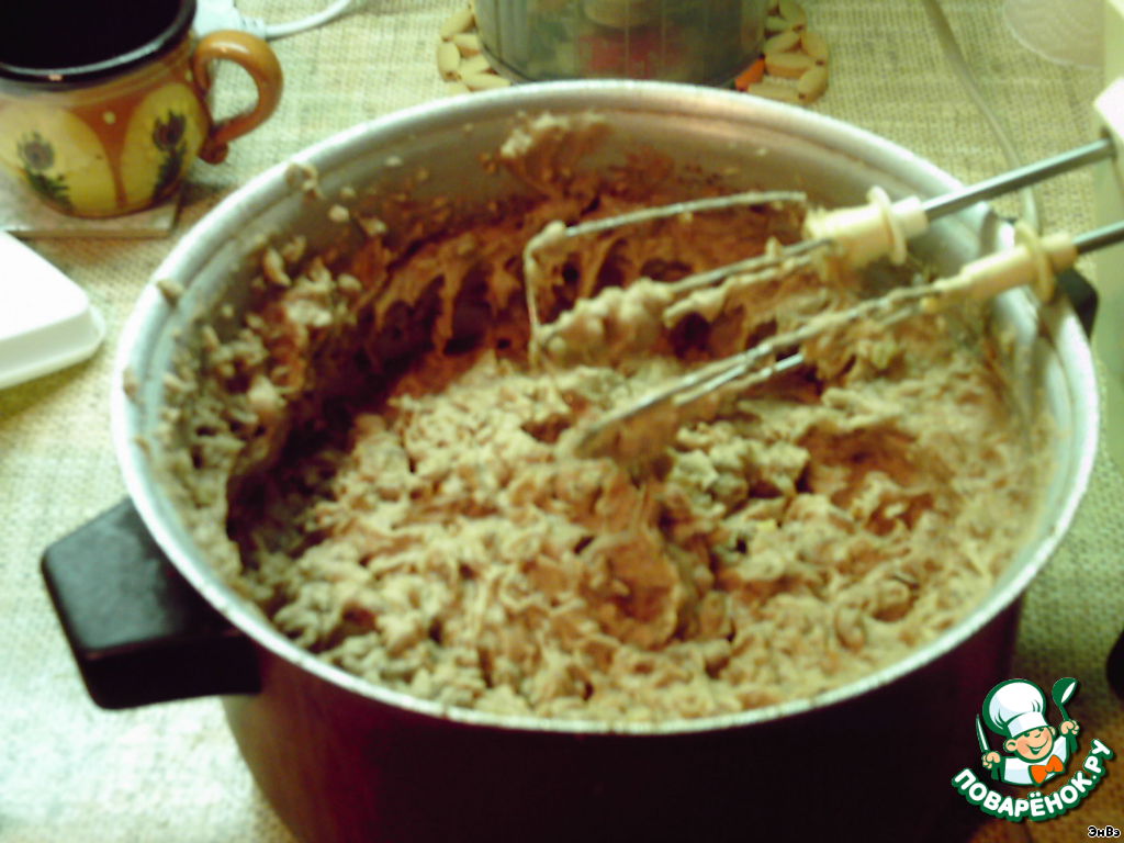 Когда фасоль была готова, я замесила дрожжевое тесто. Можно взять готовое. Тесто не должно быть крутым, чем мягче, воздушнее оно будет, тем лучше. Пока тесто подходит, займемся начинкой. Сначала я размяла фасоль пюрешницей