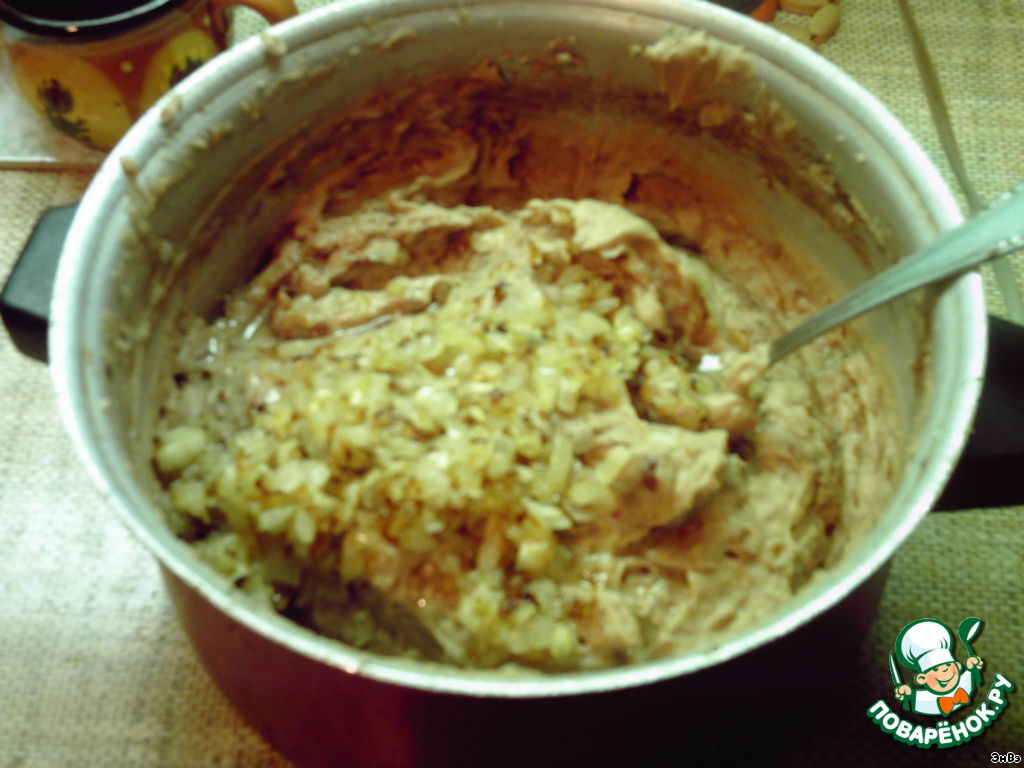 Затем добавила порезанный кубиками и обжаренный на подсолнечном масле до золотистого цвета лук, хорошенько перемешала, посолила, поперчила. Получившаяся начинка должна быть чуть-чуть пересолена, потом тесто эту лишнюю соль заберет на себя и все будет гармонично. Но не перестарайтесь!