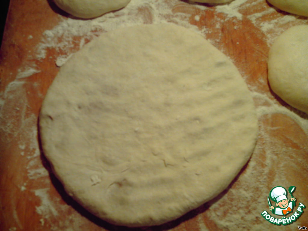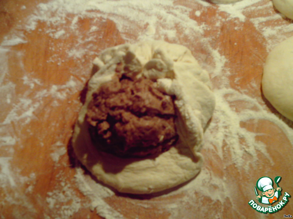 Теперь приступаем к основному этапу. Берем один тестяной шарик, расплющиваем его рукой до размера десертной тарелки, выкладываем начинку и начинаем присобирать края.