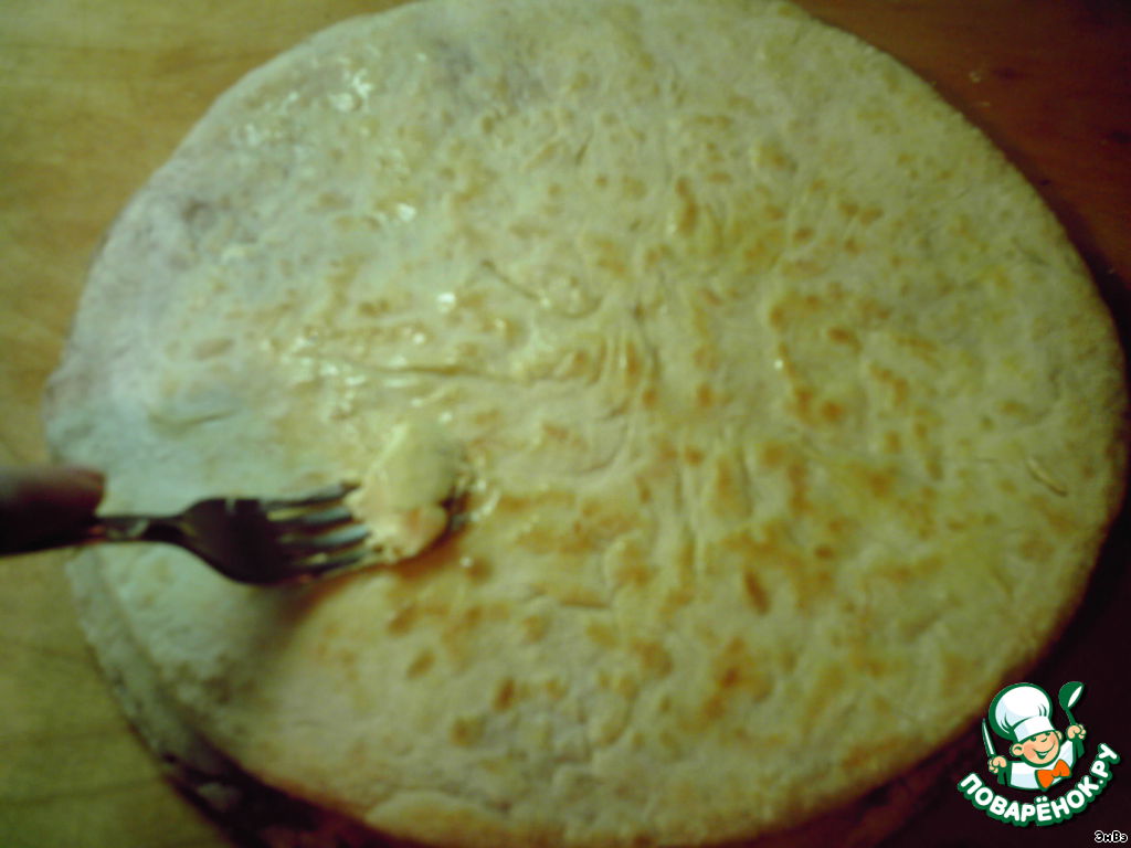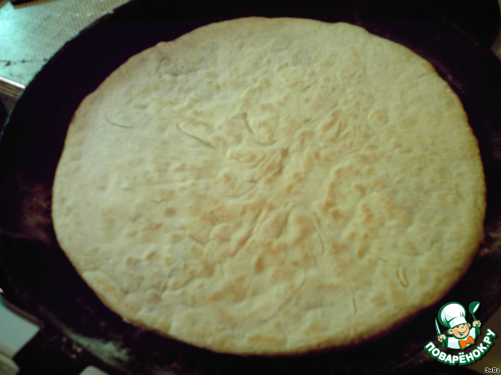 Нагреваем сковороду и слегка присыпаем ее мукой. Получившееся лобиани диаметром должено быть меньше сковороды. Теперь осторожно просовываем под него ладонь, и переносим на сковороду, и еще раз, но уже быстро разравниваем его, доводя до размеров сковороды. Пока одно жарится, готовим другое.