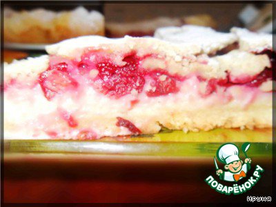 Большую часть теста равномерно распределяем по форме, делая небольшие бортики. На получившуюся основу выкладываем остывший заварной крем и вишни. Вишни чуть присыпаем сахарной пудрой.