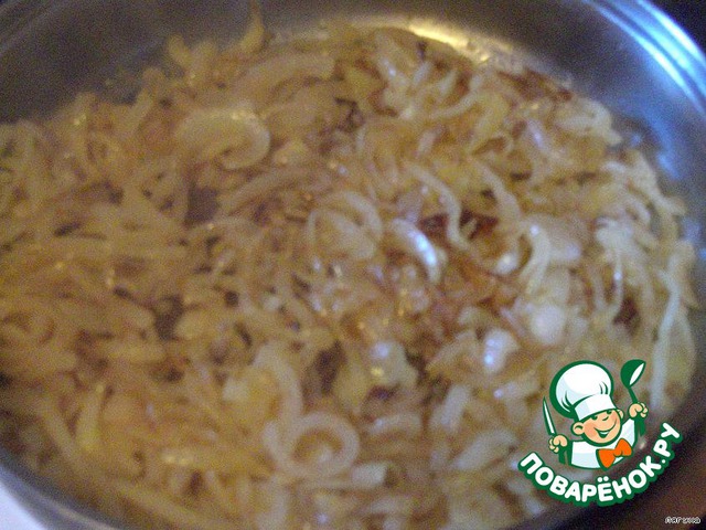Делаем начинку. Нарезаем лук полукольцами и обжариваем его на сливочном масле до золотистого цвета, остужаем.