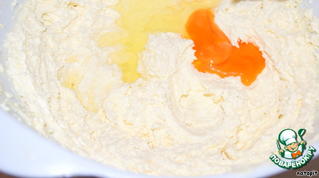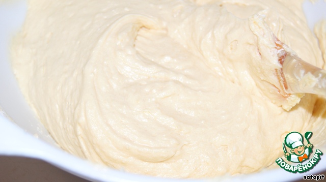 Добавить муку, просеянную вместе с разрыхлителем, перемешать лопаткой.