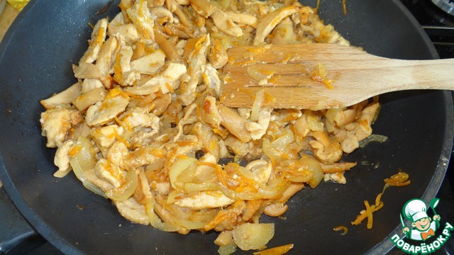 Когда слегка обжарится начинка - влить соевый соус, перемешать;