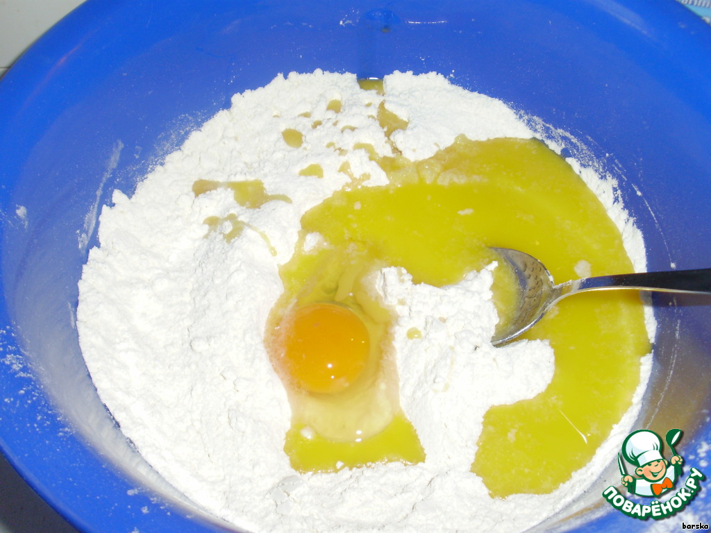 Соединить муку, 120 г сахара, разрыхлитель, 1 пакетик ванильного сахара, щепотку соли, размешать. Добавить яйцо и 130г растопленного сливочного масла или маргарина, замесить тесто.