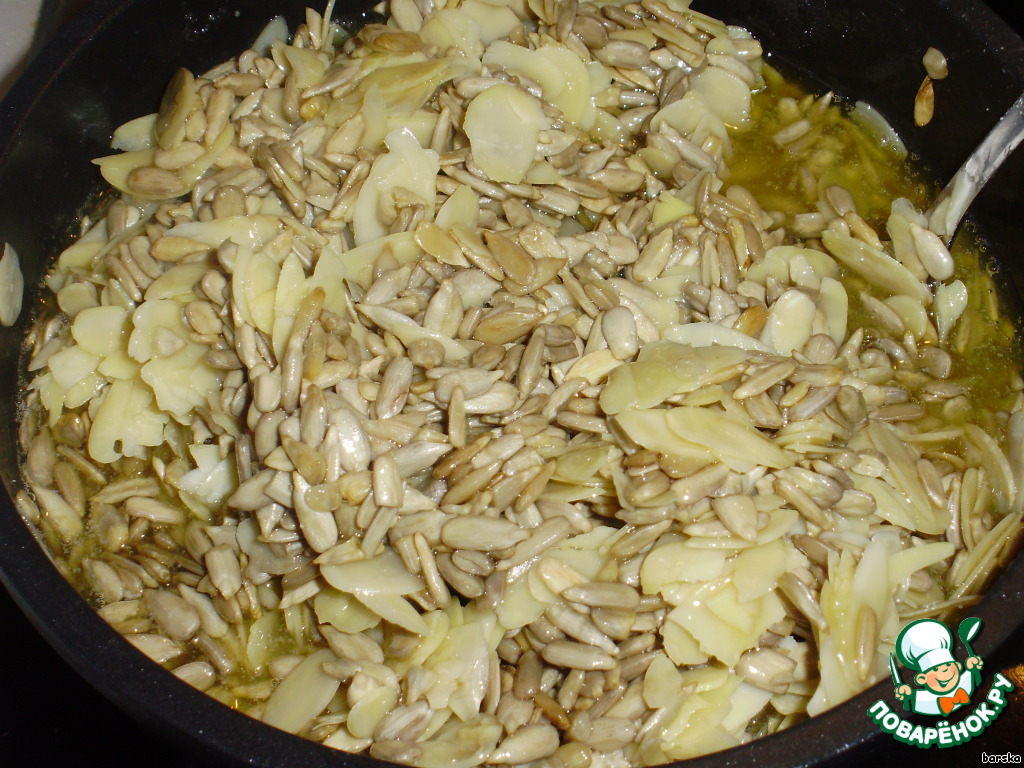 Начинка: поставить на огонь кастрюльку (желательно - с антипригарным покрытием) и выложить в неё ВСЕ компоненты для начинки. А именно: 200 г масла, 160 г сахара, 1 пакет. ванильного сахара, 4 ст.л. воды, мёд, 400 г очищенных семечек и 100г (это было у меня) миндальных листочков. Довеcти всю эту смесь до кипения.