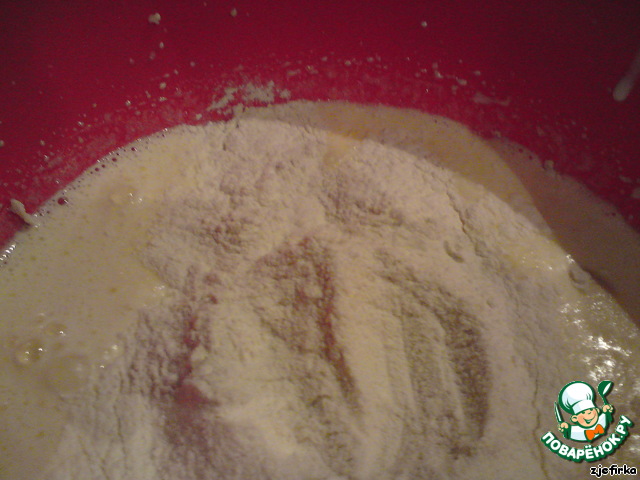 Яйца взбить с сахаром добела, добавить сметану (я добавляла кефир), соль, соду гашеную, растопленный маргарин, муку. У меня вместо маргарина использована сметана, но такая, что её можно резать ножом. Когда я её растопила, она ничем от маргарина не отличалась.