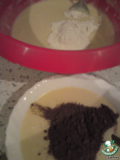 Тесто должно получится, как густая сметана. Массу разделить на 2 части. В одну добавить 2 ст.л. муки, а в другую - 2 ст.л. какао.