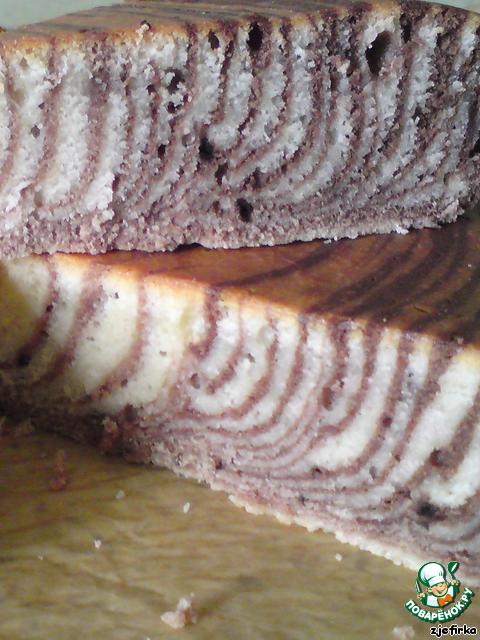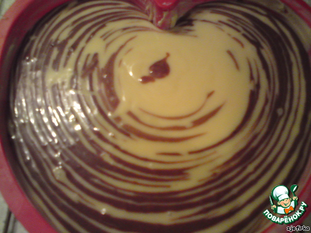 Форму смазать маргарином (не подогревать). Выкладывать поочерёдно: ложку светлого теста, ложку тёмного - одну на другую. Тесто само растекается. И получается примерно так.