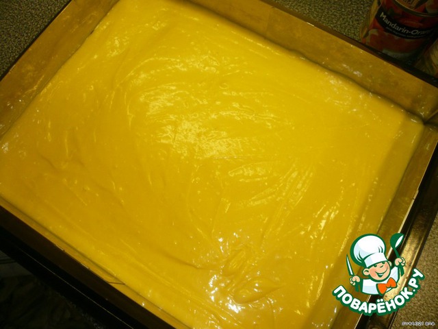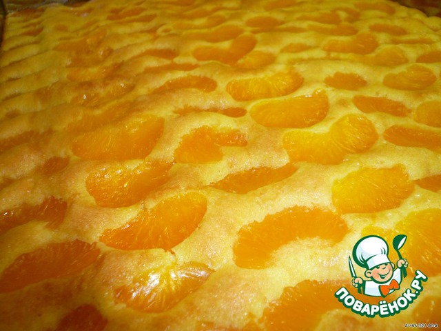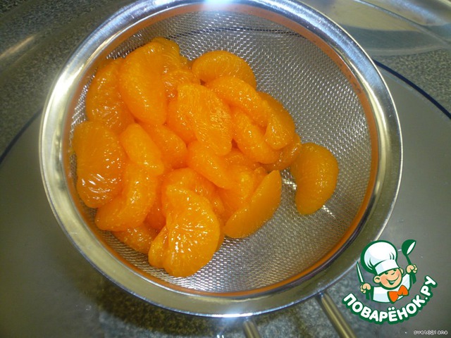 Мандарины откинуть на дуршлаг, хорошенько слить жидкость, разложить дольки по всей поверхности нашего теста.