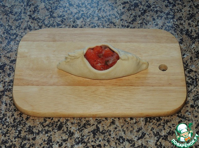 Соединить уголки лепешек и защипать. Слегка потянуть за кончики для придания пирожку нужной формы.