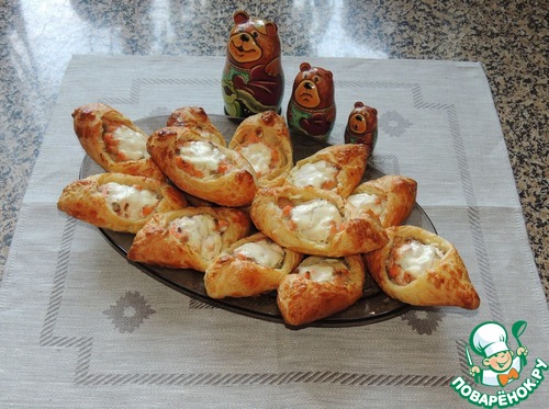 Всего за час аккуратной работы у Вас получится целое блюдо аппетитных, сочных, хрустящих расстегаев. Приятного аппетита! P.S. Обычно я покупаю целую охлажденную рыбину (семга или форель) и сразу ее разделываю. Голова и кости пригодятся для рыбного супа, средняя часть - для стейков и запекания, а хвост, в котором нет мелких косточек - в самый раз подходит для расстегаев.