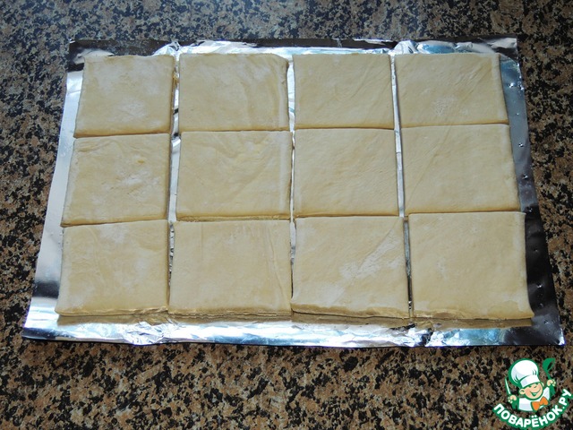 Тесто разморозить. Аккуратно разрезать упаковку (не стоит использовать лишнюю посуду!), каждую пластину теста разделить на 6 частей.