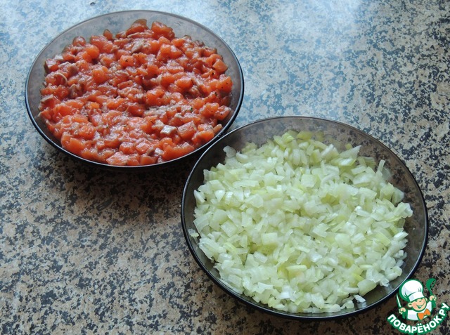 Для начинки мелко нарезать лук, присолить. Чуть крупнее порезать рыбу, посолить, добавить приправу для рыбы или сушеный укроп.