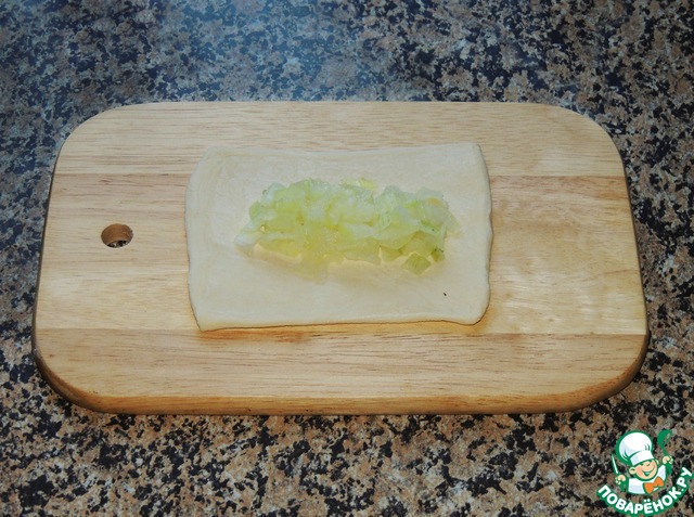 На присыпанной мукой доске чуть раскатать прямоугольник теста (не слишком тонко). В середину лепешки положить столовую ложку лука.